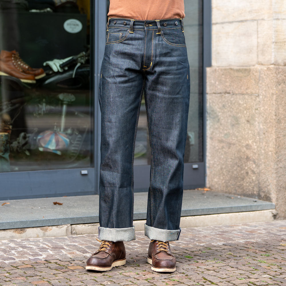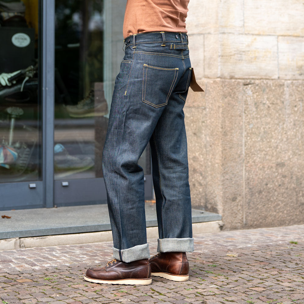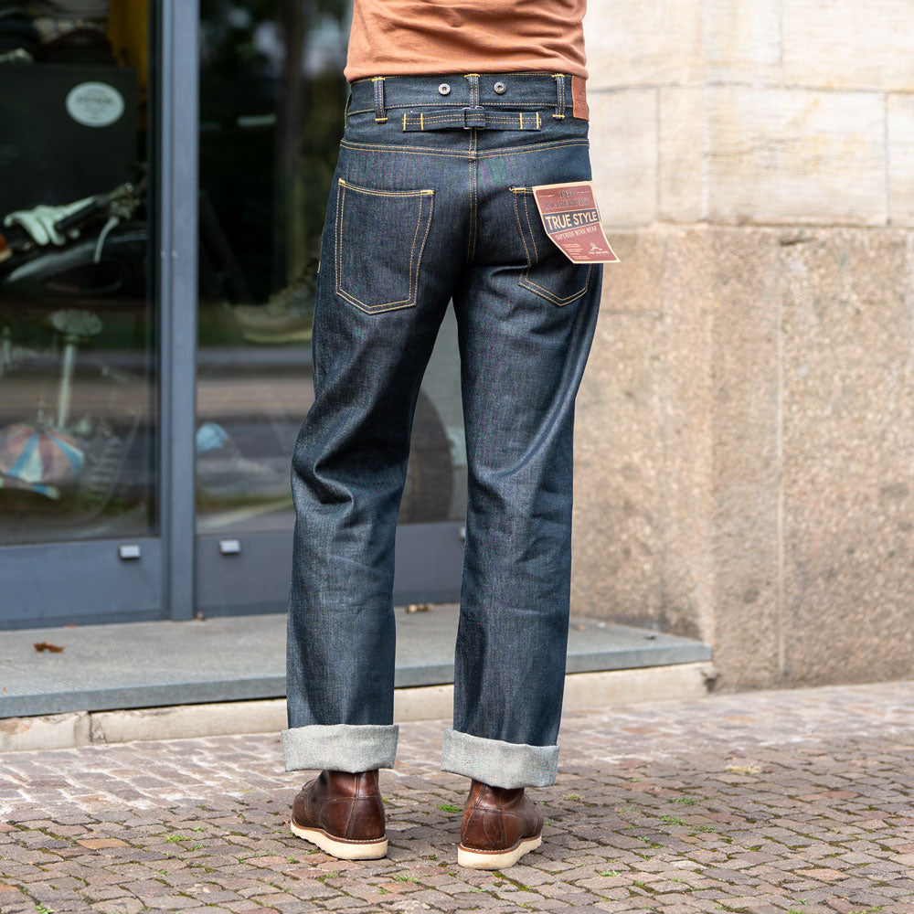 Die 1937 Roamer Pant der Pike Brothers ist eine typische Arbeitshose, wie sie in den 1930er Jahren in den USA getragen wurde. Charakteristisch für Hosen aus der Zeit ist der weite Schnitt und der hohe Bund. Das war keine Mode sondern Grundkriterium von Denim Hosen damals. Denn Hosen aus Denim waren bis zu Beginn der 1940er Jahre als Überhose gedacht, um die Kleidung darunter zu schützen. Um die Hose problemlos anziehen und tragen zu können, musste der Schnitt weit sein. Man kann Hosenträger anbringen und es gibt durch den Riegel am Rücken eine einfache Möglichkeit, die Hose am Bund enger zu machen.