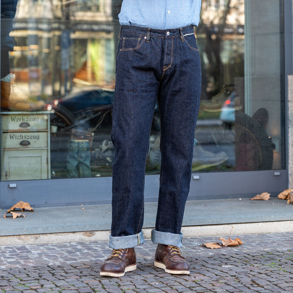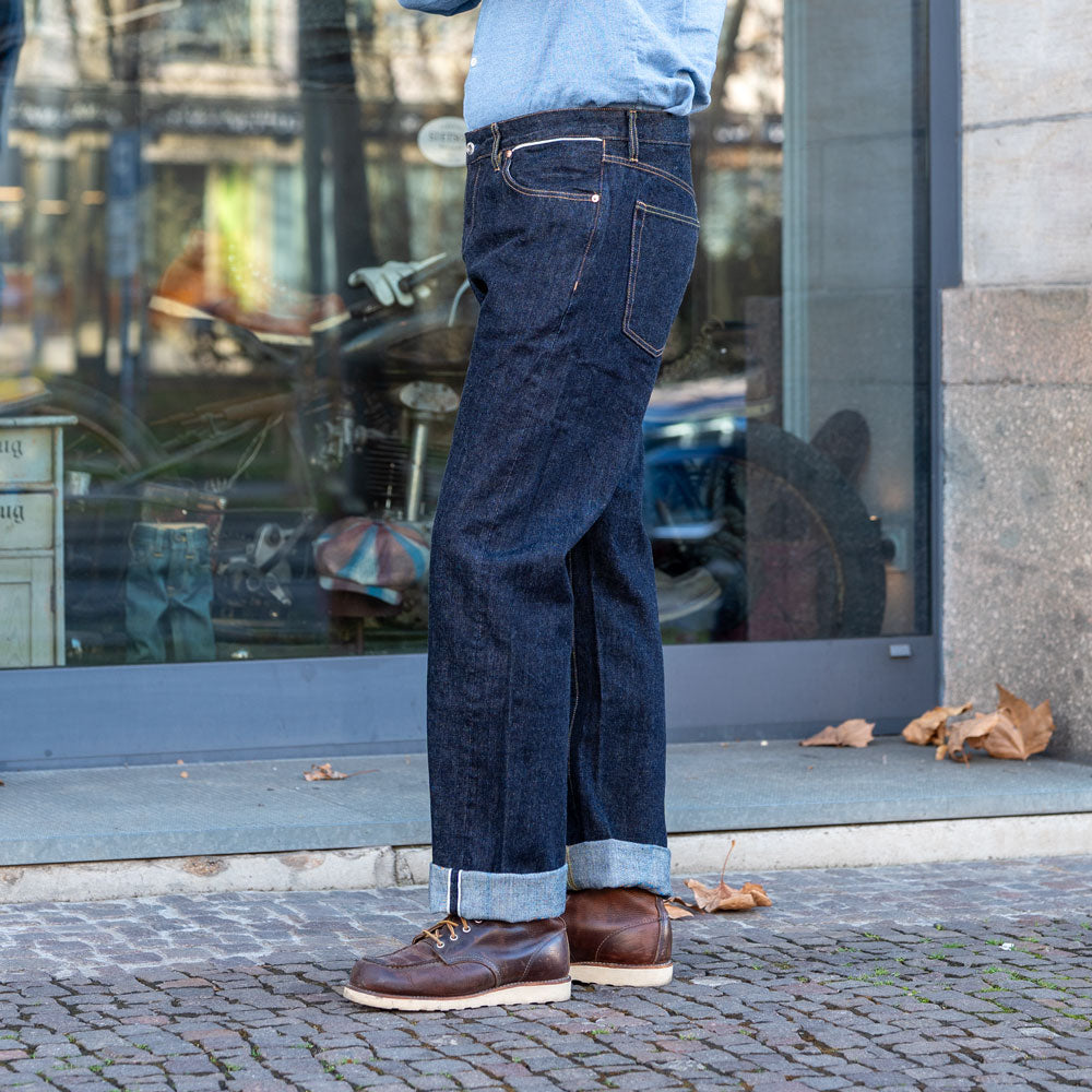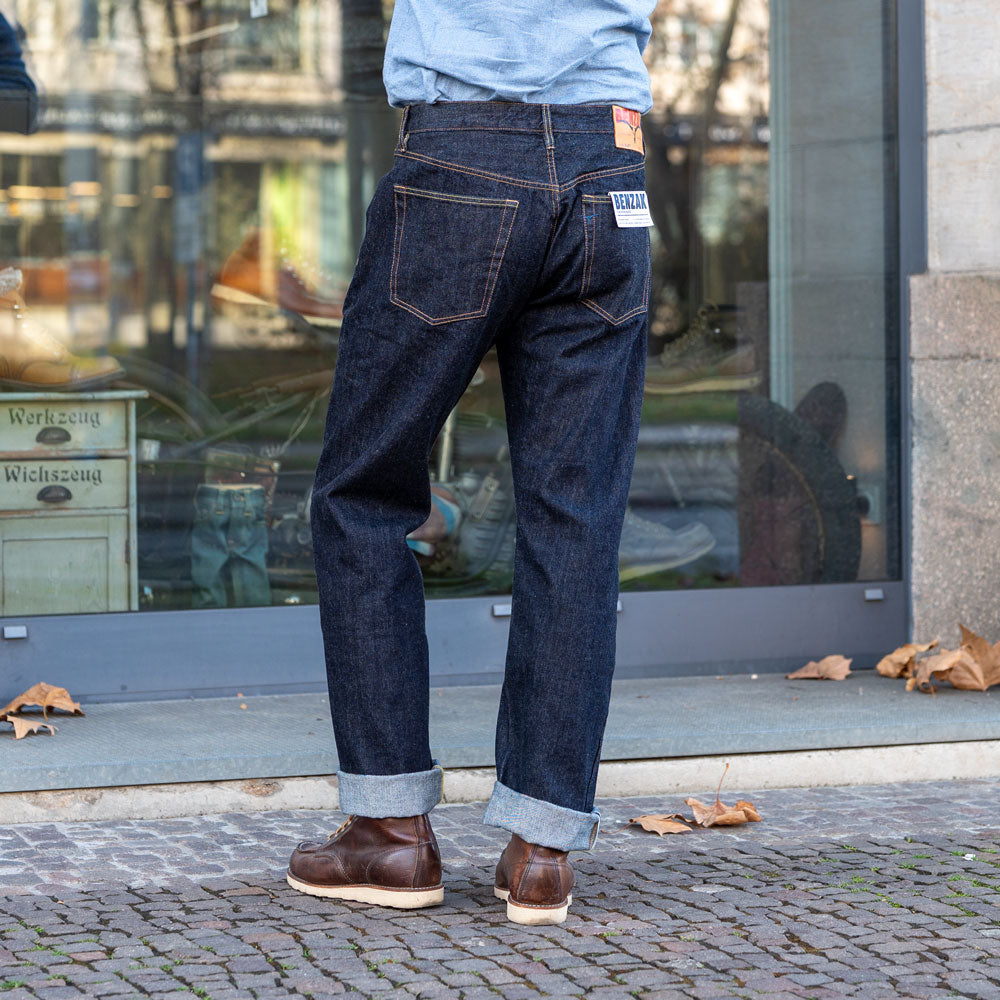 Das 14 oz Selvedge Denim besticht durch seinen besonderen Charakter und interessante Details. Er wurde originalgetreu nach Vintage-Denim aus den 1940er Jahren gefertigt, sowohl hinsichtlich des Indigotons als auch der Konstruktion. Denim aus dieser Zeit war meist nicht vorgewaschen – genau wie unsere Version. Das Problem bei nicht vorgewaschenem Denim ist, dass er nach dem ersten Waschen bis zu 10 % einlaufen kann. Deshalb hat Benzak die Kleidungsstücke bereits im Werk vorgewaschen und das Schnittmuster so angepasst, dass sie nach dem ersten Waschen die korrekten Maße haben. So können Sie Ihre gewohnte Größe bestellen und müssen sich keine Gedanken über das Einlaufen machen. Ungewaschen wiegt der Stoff ca. 12 oz pro Quadratyard. Durch das Einlaufen nach dem Waschen erhöht sich das Gewicht jedoch auf 14 oz pro Quadratyard, da sich die Fasern zusammenziehen und enger zusammenrücken. Dadurch befindet sich mehr Garn auf demselben Quadratyard, was dem Stoff trotz des Waschens ein steifes Gefühl verleiht. Das 14 oz. Selvedge Denim wurde von Collect Mills in Japan gewebt.